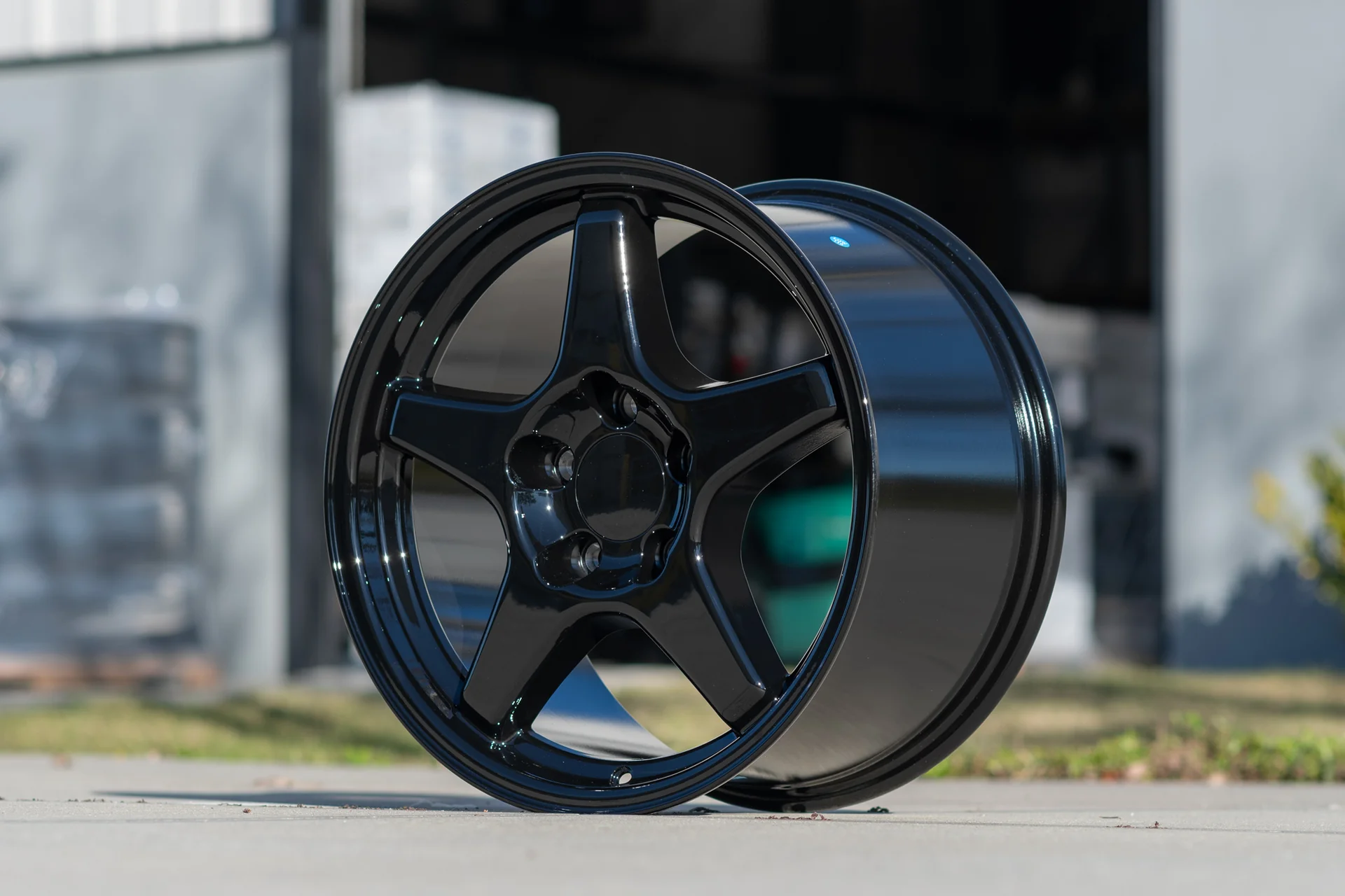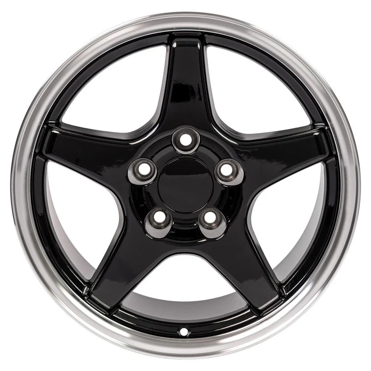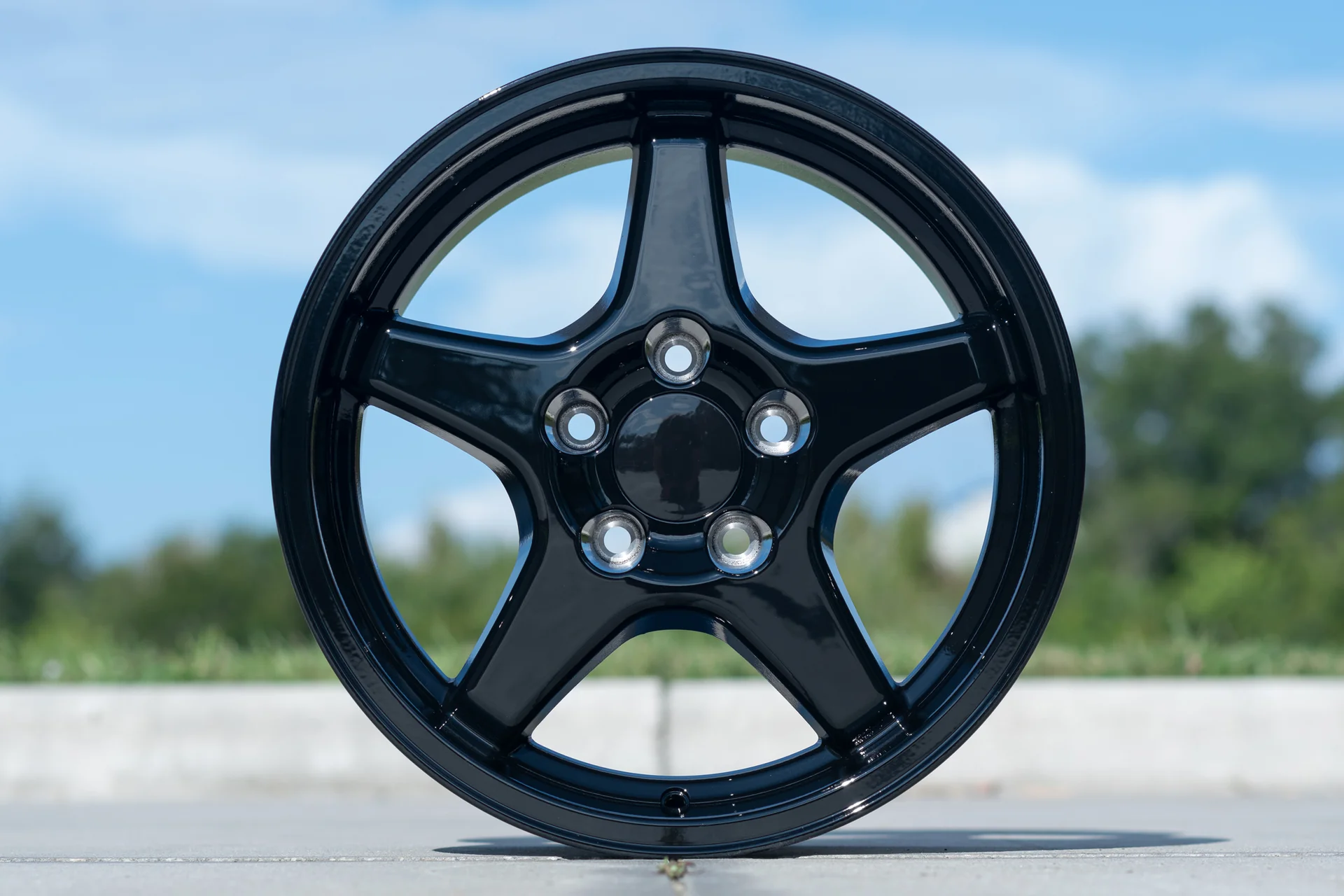 UPC 9509462 17 Inch Rims Fit Corvette Camaro ZR1 Style CV01 Black Wheels and Toyo Extensa Hollander 5035. This is a non-staggered set of four rims and four tires will arrive to you mounted and balanced. The Toyo Extensa HP II 275/45-17 is a High Performance All Season Tire designed as a value driven option providing a perfect balance between outstanding performance, quality and styling. The unidirectional tread design provides a perfect blend of all season traction. Full depth wave sipes provide a smooth and quiet ride, minimizes irregular wear and improves snow traction. Single cut and double cut tapers optimize block stiffness enhancing braking performance. Finally, the silica coumpound provides a better wet perfomance while maintaining the tread life performance of your new Toyo Extensa HP II Tires. 17×9.5 Rims Fit C4 Corvette and F Body Camaro ZR1 Style CV01 . These are Gloss Black Replica Wheels Hollander Number 5035